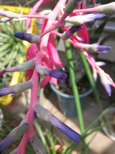 ケセネリア初開花なのでメモっておく。 2014年サンフランシスコで購入した株、開花はこれが初めてだ。 Quesnelia marmorata ‘Tim Plowman’ いきなり筒から重量感がある蕾がヌッって出てくるので、ビビる。 蕾に気付いてから5日程度で開花、早い。 花弁は反ら…